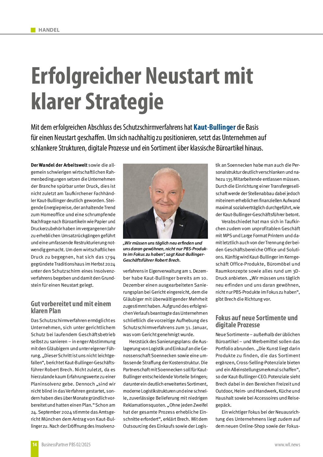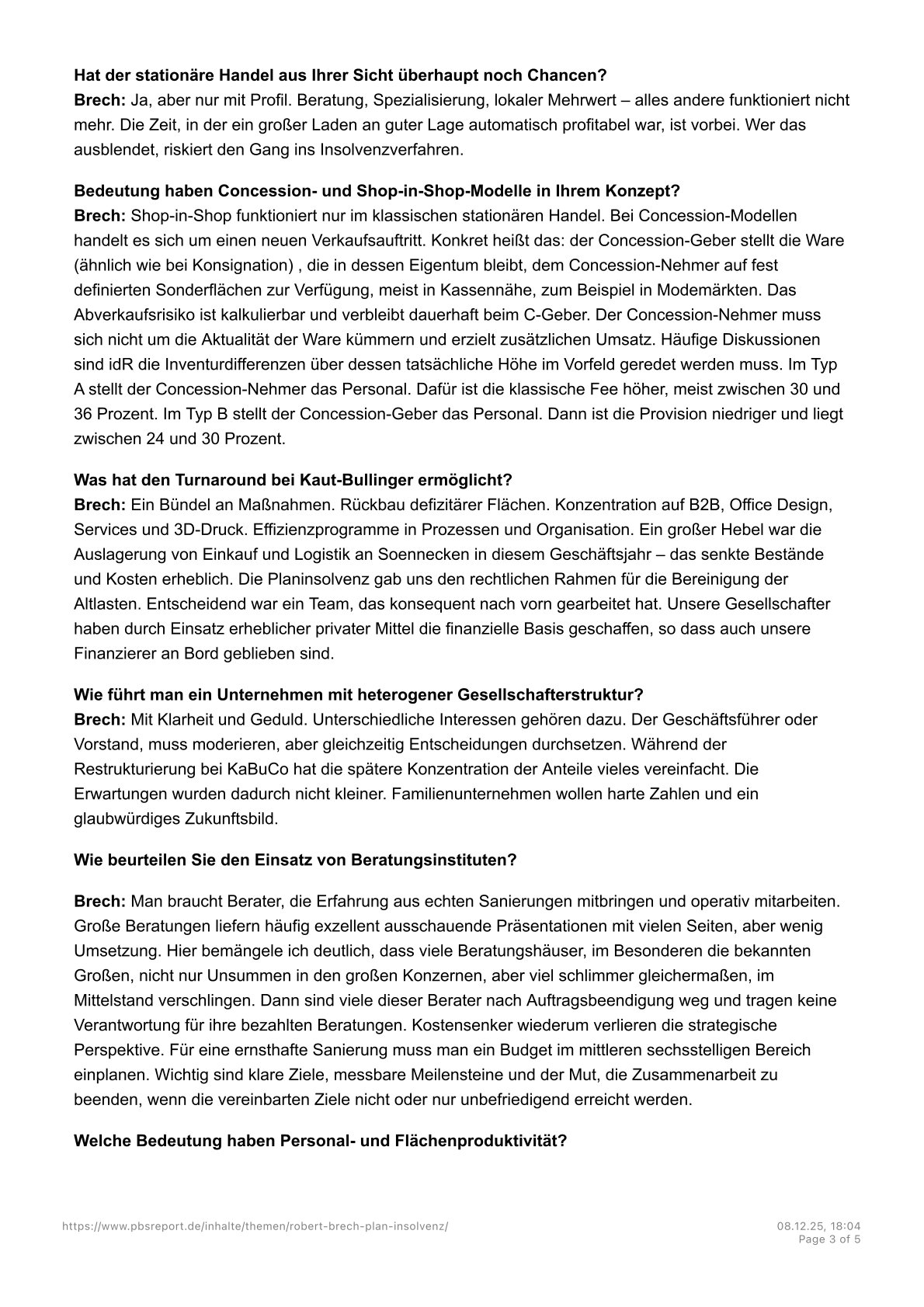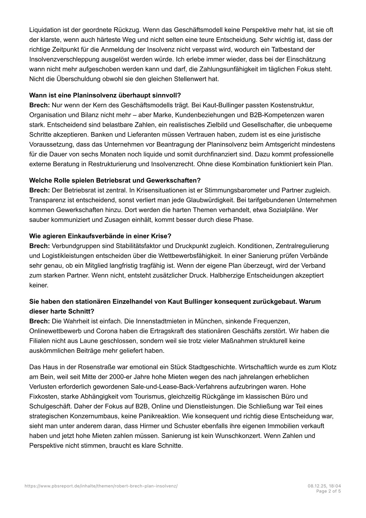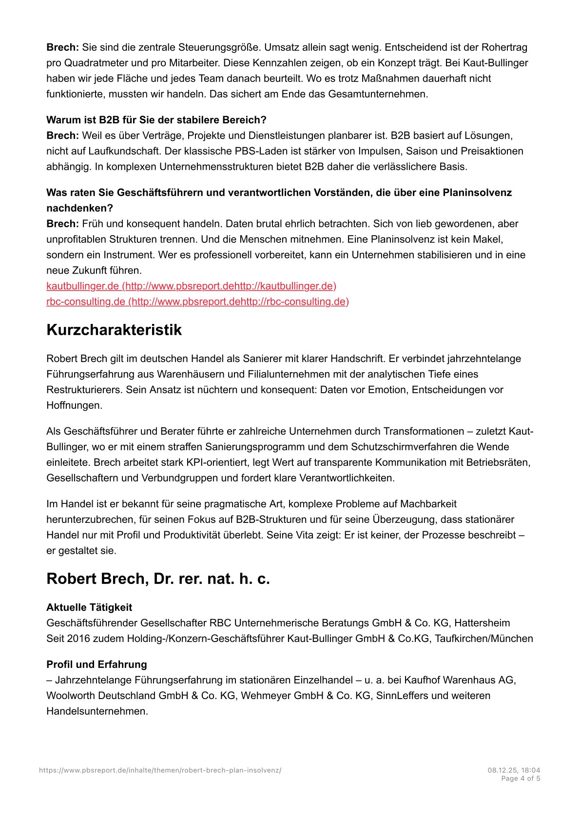 „In 2003 he was appointed Spokesman of the Management Board of Wehmeyer GmbH, Aachen. His hands-on and committed management style was the key to the successful sale of Wehmeyer during the KarstadtQuelle/Arcandor Group crisis. At the same time, Mr. Brech, as crisis manager and COO of Sinn Leffers, was responsible for the operational tasks of the company until a buyer was found in 2005.”